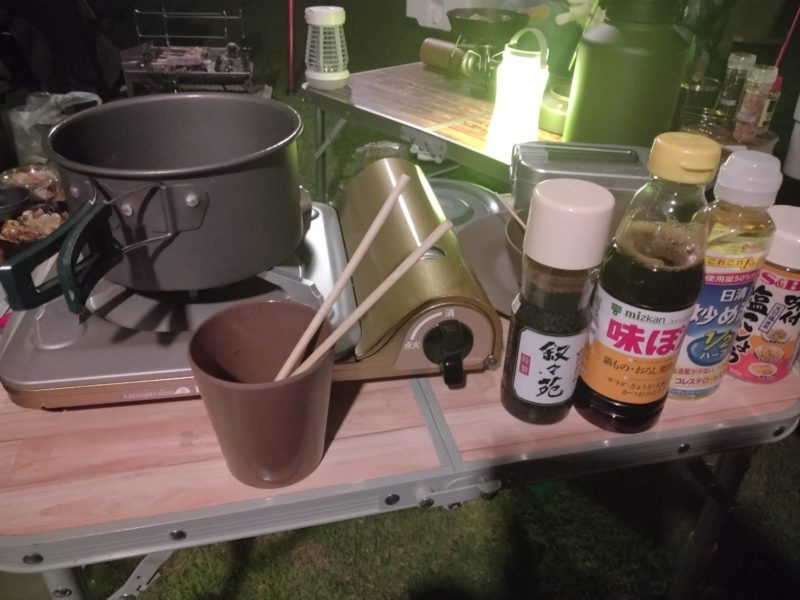 俺の持ち物はガスコンロと皿、焼肉のタレ、ポン酢、油、塩コショウのみ。
